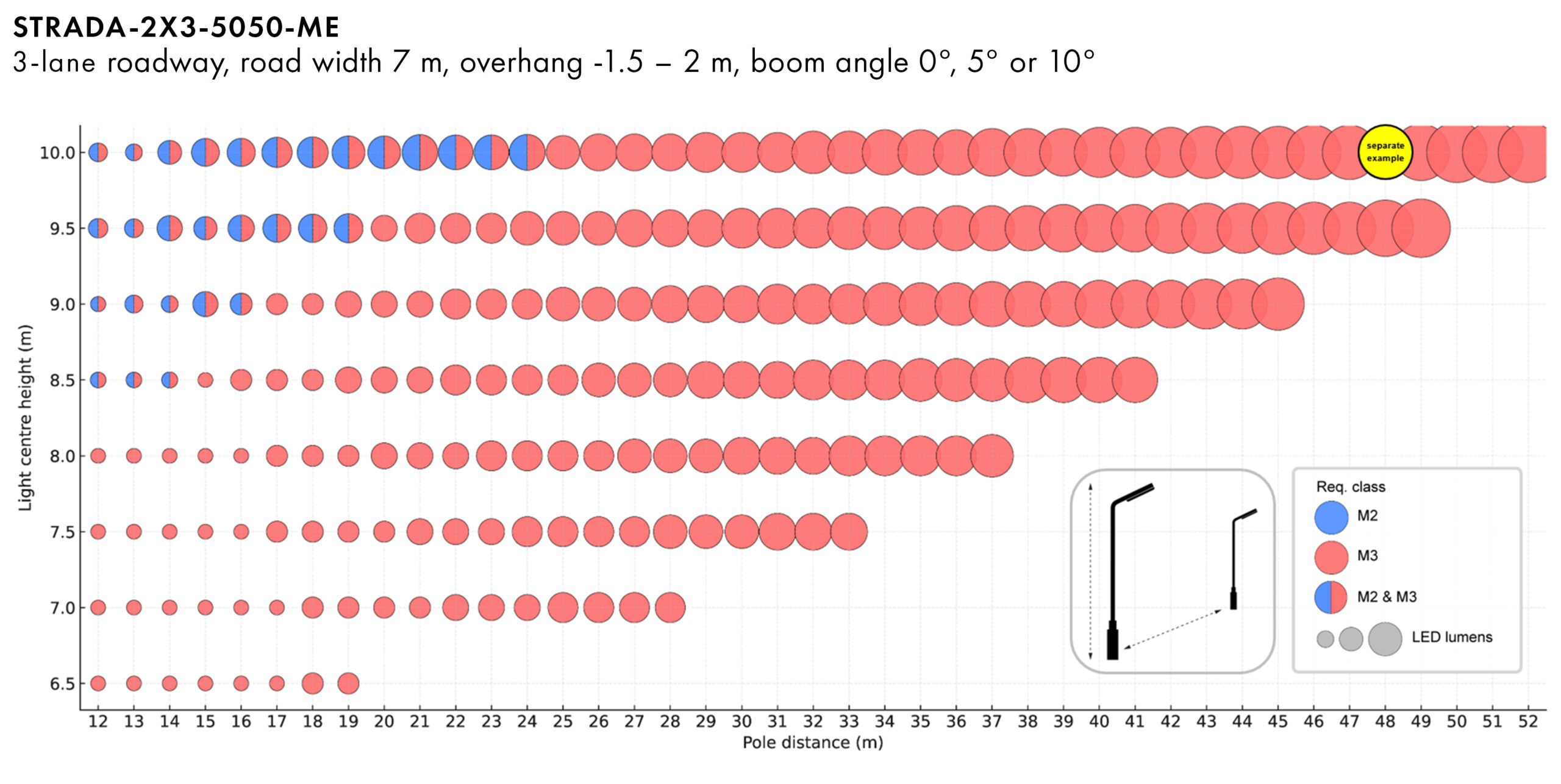 See how C3, M2 and M3 street lighting requirements can be met with different mounting height and pole distance setups in the table below.