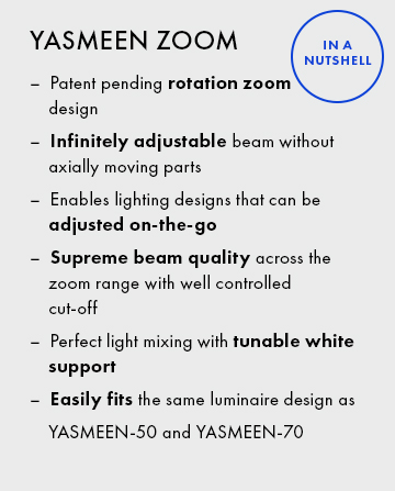 YASMEEN ZOOM optics are an innovative addition to the YASMEEN family that enable a whole new world of lighting possibilities thanks to their flexibility and adaptability. Constantly changing lighting concepts are always optimally lit, and lighting designs can be adjusted ‘on the go’ even without detailed upfront planning, to guarantee perfect lighting whenever and wherever needed.